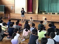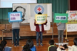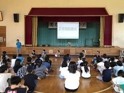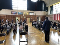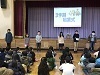 中学校区での「ハッピーなかま集会」で学んだことを6年生が全校児童に伝えた...